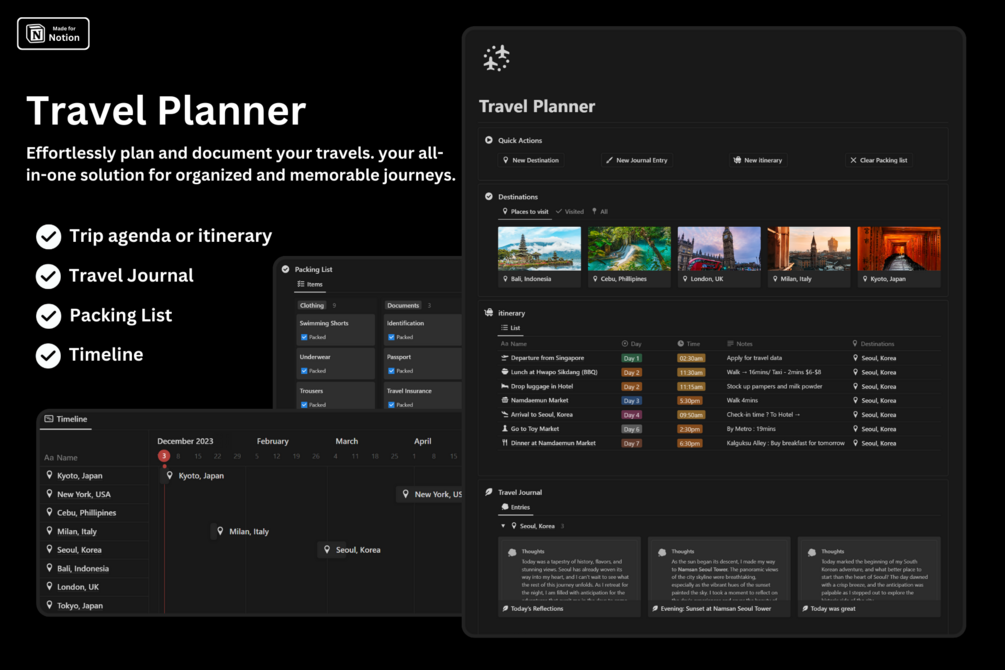 Enhance your travel organization with our Travel Planner Notion Template – the ultimate companion for seamless trip planning. This versatile template brings together essential features to streamline your travel preparations.